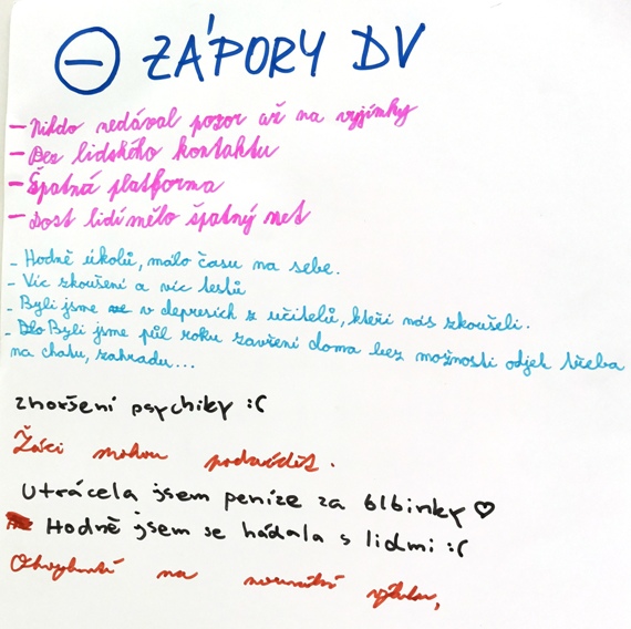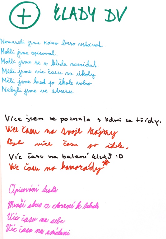Dostali jsme za úkol sepsat klady a zápory distanční výuky (DV) a také na co se těšíme. Pracovali jsme ve skupinách a výsledky naší práce můžete vidět na přiložených fotografiích. Skoro každý měl jiný názor, ale nakonec to všichni zvládli.