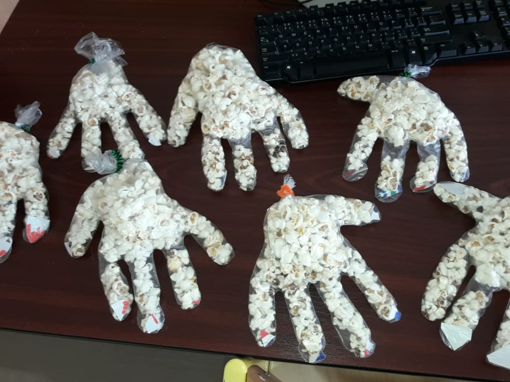 Na Halloweena jsme měli, po halloweenské matematice i fyzice, tvořivé dílničky. Nejprve jsme si vyrobili podzimní věnec na dveře, poté si připravili strašidelnou svačinku. Z toustového chleba jsme si vykrajovátkem vykrojili ruku nebo postavičku a namazali i nazdobili marmeládou. Po svačince, kdy nám opět maminka Danečka připravila sladké strašidelné pohoštění - muffinky (MOC DĚKUJEME), jsme si zasoutěžili. Před závěrečnou hrou jsme si ještě vyrobili ruku z popkornu. Jak se nám to povedlo, můžete vidět z fotek ve fotogalerii.