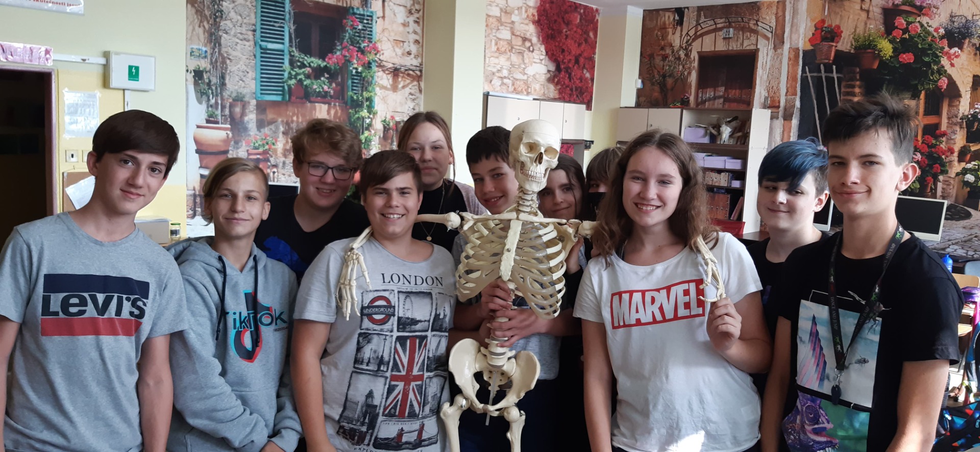 Učivo 8. ročníku je biologie člověka. Poslední hodinu jsme začali probírat opěrnou soustavu. Na našem "Kostíkovi" jsme si ukazovali jednotlivé kosti, zakřivení páteře, švy na lebce apod.