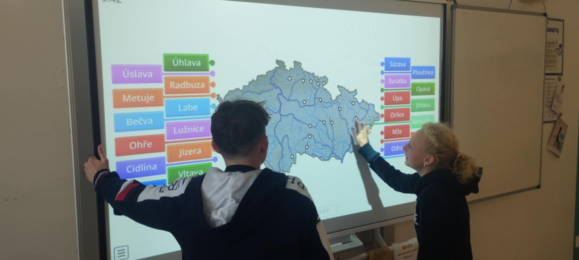 V hodinách zeměpisu se v 8. ročníku budeme zaobírat Českou republikou. Momentálně jsme začali probírat vodstvo. Například řeky Labe a Vltavu známe již z nižšího stupně a nedělá nám problém je najít. Horší už je najít další řeky. A tak trénujeme na interaktivní tabuli a přiřazujeme názvy řek do slepé mapy. Zatím se nám to docela daří.