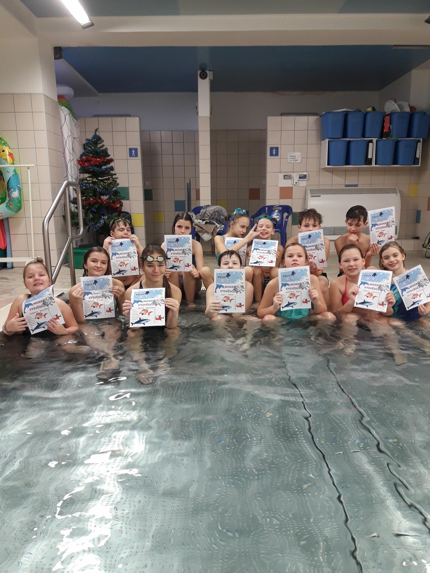 Na poslední 20. hodině jsme se dozvěděli, jak se chovat při záchraně tonoucího, zopakovali jsme si splývání na břiše i na zádech, soutěžení ve družstvech. Náramně jsme si to užili a také jsme na konci hodiny dostali "mokré vysvědčení".
