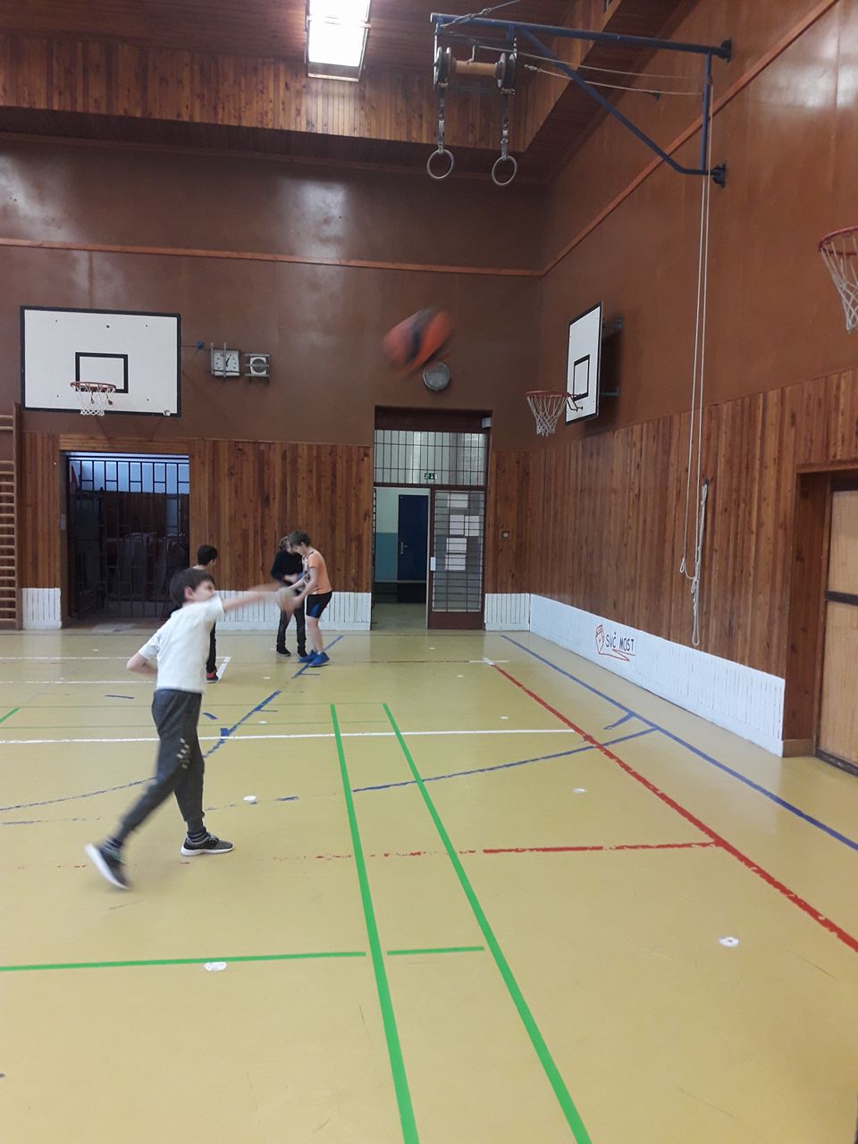 Po plaveckém výcviku nás čekalo sportování v tělocvičně. Vyzkoušeli jsme si :mini-basketbal - hody na koš, šplh na tyči a nebo nácvik přeskoku kozy. Nejprve jsme skákali na švédskou bednu, poté s použitím odrazového můstku.