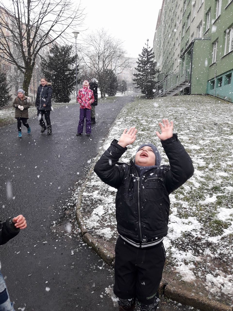 Cestou z oběda nám v pátek 19. ledna sněžilo. Padaly tak velké vločky, že jsme soutěžili, kdo chytí nejvíce.